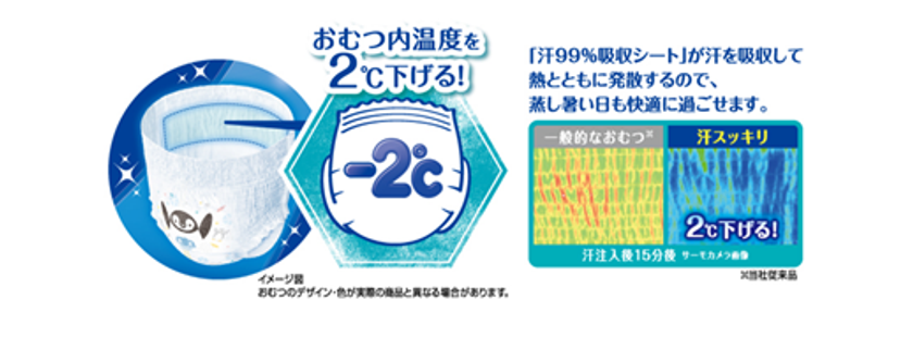 (2) “汗99%(※1)吸収シート”が紙パンツ内の熱こもりを発散