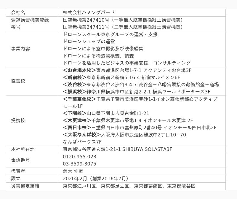 株式会社ハミングバードは、2018年より都内を中心に「ドローンスクール東京」の運営を行っていましたが、2022年11月に「ドローンスクール横浜校」を横浜ワールドポーターズ内に開校しました。