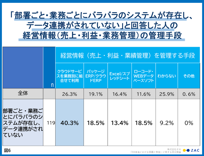 という結果になりました。クラウドサービスの組合わせで経営情報を管理する場合、他の管理方法と比較してデータ連携が難しく、DX推進の課題となりやすい傾向が見受けられます。経営データの収集・分析を効率的に行うためには、データの一元管理が可能なパッケージERP・クラウドERPの活用が有効な選択肢の1つと言えそうです。(図6)