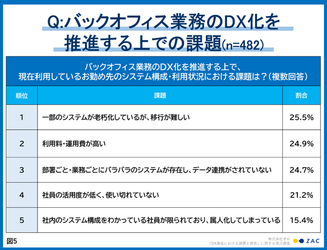 以前から、基幹システムのレガシー化によりDXの取り組みが遅れること、またデータの収集・分析を行う際、部署や業務ごとに別々のシステムを使用することにより、「データの断絶」が発生していることが問題視されていました。今回の調査もそれらを裏付ける結果となっています。(図5)