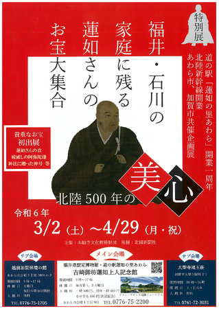 個人や団体などが所有する蓮如さん関連の作品出展を公募し、展示します。両県内に点在する蓮如さんのお宝を借用して公開することにより、 郷土の偉人たる蓮如さんの魅力の再発見につなげ、それによって育まれた両県民の精神文化と歴史を地元の次世代に伝え、郷土愛を育むとともに県外にも広く発信します。
