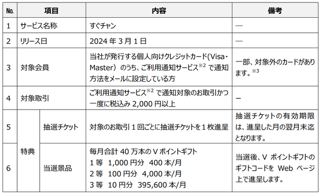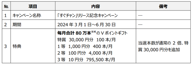 さらに、本サービスのリリースを記念し、より多くのお客さまに本サービスでの当選体験をしていただくべく、当選本数が通常の2倍となる「すぐチャン」リリース記念キャンペーンを開催します。本キャンペーンでは特賞としてVポイントギフト30,000円分が当たるチャンスもございますので、ぜひ奮ってご参加ください。