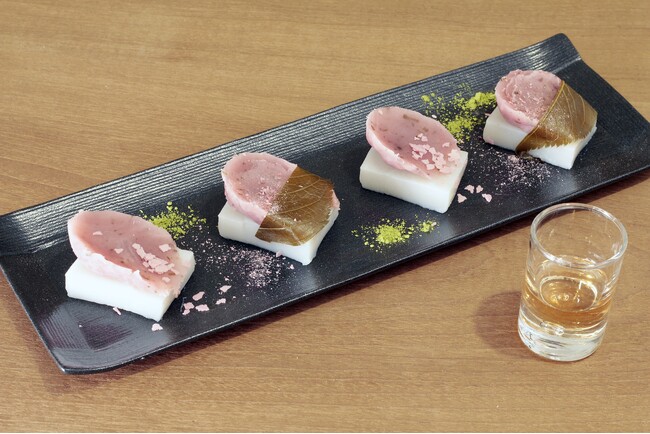 船橋屋の看板商品であるくず餅に春の訪れを感じさせる桜餡と桜葉をのせてご提供。隠れ人気メニューのあんくず餅の桜ver.が登場します。お好みで桜エキスと白蜜で調合されたさくら蜜をかけていただくと更に桜葉の香りが広がります。抹茶粉と桜のフリーズドライで周りを囲み華やかさをプラス。桜の香りと抹茶のほろ苦さが相性良く、テーブルの上でも“お花見”をお楽しみいただける一品です。