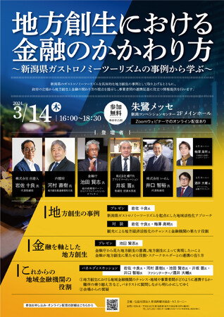 3月14日、「地方創生における金融のかかわり方 ~新潟県ガストロノミーツーリズムの事例から学ぶ~」が新潟県・朱鷺メッセにて開催されます。