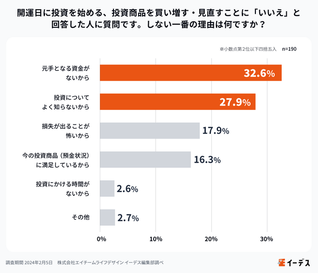 投資を始めない、または投資商品の見直しを考えてない人の32.6%が「元手となる資金がない」と回答、次いで27.9%が「投資についてよく知らないから」と回答