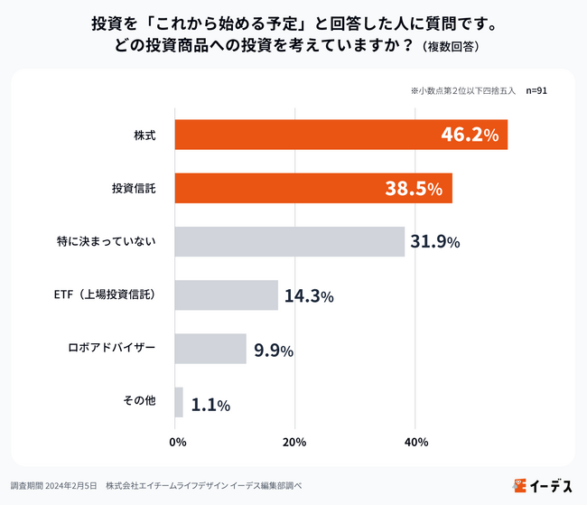 また、これから投資を始める予定の人に「どの投資商品に投資していますか?」と質問したところ、「株式(46.2%)」「投資信託(38.5%)」という結果になりました。
