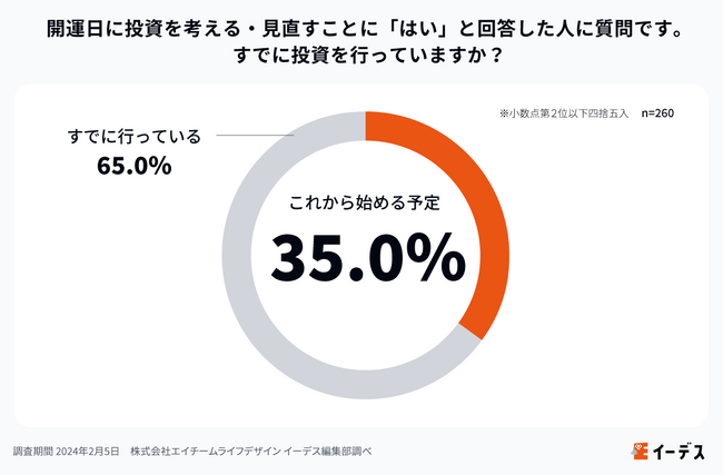 また、「はい」と回答した人のうち、65.0%の人が「すでに投資を行っている」と回答し、35.0%の人が「これから投資を始める予定」と回答しました。