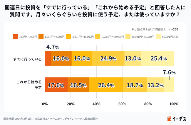 なお、すでに投資を行っている人は「50,001円以上(25.4%)」が最も多く、これから投資を始める人は「5,001円~10,000円(26.4%)」が最も多い結果になりました。