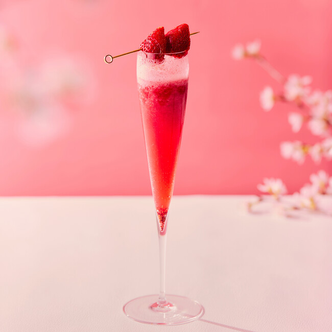 春爛漫を表現したシャンパン・カクテル。シャンパンと合わせたいちごとラズベリーの濃厚なピューレは、クランベリージュースに漬け込んだ桜の葉で風味付けをしました。トップのいちごには金粉をまとわせ、特別感を演出した一品です。