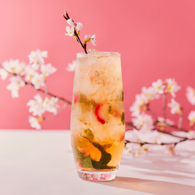 春の季語である桜餅をイメージしたカクテル。桜の葉と塩漬けにした桜の花弁を、京都生まれのクラフトジン「季の美」に漬け込み、桜のリキュールに合わせました。添えたいちごとのペアリングもお楽しみいただける一品です。お好みでトニックウォーターを合わせてお召し上がりください。