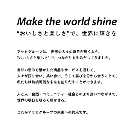 アサヒグループは、世界各地の事業やブランドをグループへ統合することで飛躍的なグローバル化を果たし、全世界で約3万人の仲間を有する多様性のある企業グループになりました。新たなグループコーポレートロゴマークは、「朝日」が日々の生活を希望の光で照らすように、世界中のグループ社員がひとつになってグローバル企業として成長、発展していく象徴となります。コーポレートステートメントでは、私たちの提供する“おいしさと楽しさ”で人と人・自然・コミュニティ・社会とのつながりを生み出し、そのつながりで世界の今と明日を明るく輝かせることを表明しています。