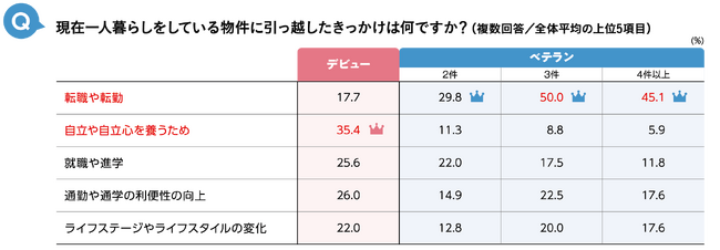 現在の物件に引っ越したきっかけを聞くと、経験物件数3件以上の住まい探しベテランは「転職や転勤」が4割以上で最多である一方、デビューは「自立や自立心を養うため」が最多でした。