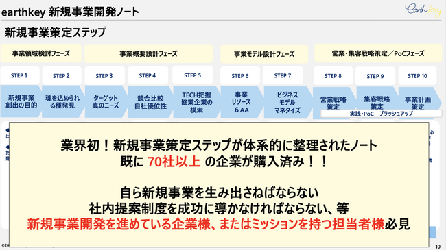 これまでプレスリリースや目立ったPRを行わない中、「大手企業を中心に70社以上」からご購入いただいております。そんな「earthkey新規事業開発ノート」がこの度パワーアップし、VOL.4をリリースいたします。
