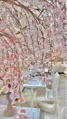 店内を色取る艶やかな淡い薄ピンク色のしだれ桜のトンネルが春の優雅な世界へと誘い、まるでお花見をしながらしだれ桜の木々の下を散策しているような、春爛漫の気分に浸れ美しい魅力溢れる幻想的な世界へとご案内致します。
