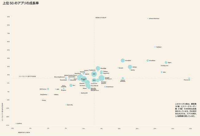 今回、右上の第一象限に入った成長リーダーの中で、顧客数で最も成長したのは1Passwordで、ユニークユーザー数で最も成長したのはAmazon Businessでした。Figma、Miro、HubSpot、Snowflake、GitHub、KnowBe4、Sentry、Zscalerといった昨年の成長リーダーは、今年も引き続き成長リーダーでした。全体の顧客数はまだ少ないですが、monday. comは今年初めて成長リーダーにランクインしました。