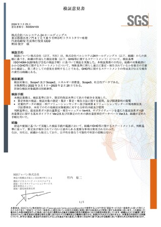 株式会社ベルシステム24ホールディングス(本社:東京都港区、代表取締役 社長執行役員CEO:野田 俊介、以下:当社)は、当社の2022 年度の温室効果ガス排出量および社会性データについてSGS ジャパン株式会社によるISO14064-3:2019 等に基づく検証により、当社の開示情報についての正確性・信頼性が確認されました。当社は、本意見書をSGS ジャパン株式会社より2月6日に受領しました。