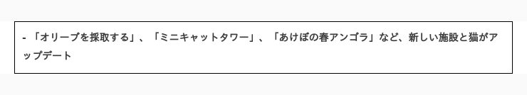 イベントの開催と共に新しい施設2種もアップデートいたしました。 まず、オリーブの木の実を棒で採集する新しい調理施設「オリーブを採取する」と猫がキャットタワーの上で昼寝をする休息施設「ミニキャットタワー」を一緒に楽しむことができます。