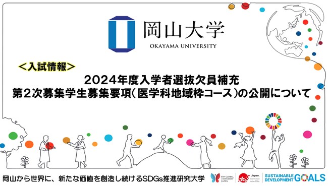 国立大学法人岡山大学(本部:岡山市北区、学長:那須保友)では、2024年度入学者選抜欠員補充第2次募集学生募集要項(医学科地域枠コース)について、以下のとおり公開しました。