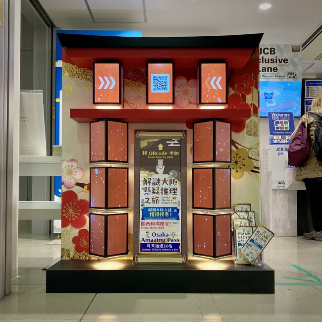 本件は、パナソニック オペレーショナルエクセレンス株式会社 ビジネスソリューション本部主導によるイベント「大阪謎解き街めぐり」のPRの一環で、ランターナ9台を活用し、鳥居型の造形に組み合わせた特別仕様のデジタル広告で、来日したインバウンド観光客の関心を引くように関西国際空港の観光案内所に展示しています。