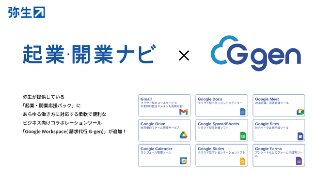 弥生株式会社(本社:東京都千代田区、代表取締役 社長執行役員:前山 貴弘、以下「弥生」)は、運営する「起業・開業ナビ」内の「起業・開業応援パック」に、株式会社G-gen(本社 : 東京都新宿区、代表取締役 : 羽柴孝、以下「G-gen」)の提供する「Google Workspace 請求代行サービス」を新たに追加したことを、お知らせします。