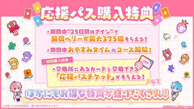応援パスを購入した日から30日以内に、25日間ログインすることで、累計375個(※)の無償ベリーを獲得できます。