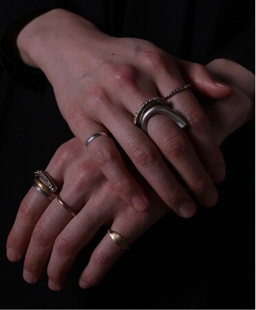 例えば、普段見慣れているビルは独立して存在し立ち並んでいますが、それらをまたぐように虹がかかると一つの大きな集合体として見え、そのアウトラインに新しい美しさが見える事があります。そんなふとした日常の中で思い立つ微妙な感覚を、デザイナーの視点でジュエリーに変換しました。1本1本は独立した指も、それをまたぐ地金のラインにより2本の指としての美しい形状が見えてきたり、手としての大きな形状が見えてくる。それは普段見慣れている自分自身の新しさが、どこにでも存在する事を教えてくれます。