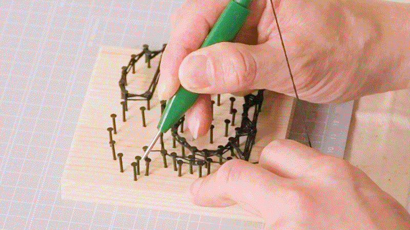 釘に糸をかけて輪郭を縁取りし、トライくんの顔を描いていきます。