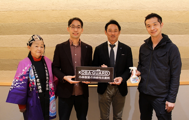 左から、老松酒造専務 前野久美子、小林製薬 日用品事業部 新分野推進グループ 上田統悟・辻野悟司、山陽盃酒造 専務取締役 壺阪雄一