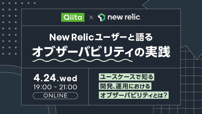株式会社エイチームのグループ会社であるQiita株式会社(本社:名古屋市中村区、代表取締役社長:柴田健介、以下当社)は、デジタルビジネスに「オブザーバビリティ(可観測性)プラットフォーム」を提供するNew Relic株式会社(本社:港区赤坂、代表取締役社長:小西真一朗、以下New Relic社)と共同で、オンラインイベント「New Relicユーザーと語るオブザーバビリティの実践 ~ユースケースで知る開発、運用におけるオブザーバビリティとは?~」を2024年4月24日(水)に開催いたします。