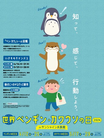 サンシャイン水族館(東京・池袋、館長:丸山 克志)は、4月25日の“世界ペンギンの日【World Penguin Day】”を含む4月12日(金)~25日(木)の14日間と、5月29日の“世界カワウソの日【World Otter Day】”を含む5月17日(金)~29日(水)の13日間で、ペンギン・カワウソの魅力を発信するとともに、絶滅が危惧されている現状に目を向けるきっかけとなるイベント「世界ペンギン・カワウソの日2024 in サンシャイン水族館」を開催します。