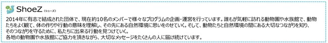動物や自然環境に関する保全教育プログラムを全国各地で行っている団体「ShoeZ(シューズ)」協力のもと、「いきものキャンパス」を開講します。