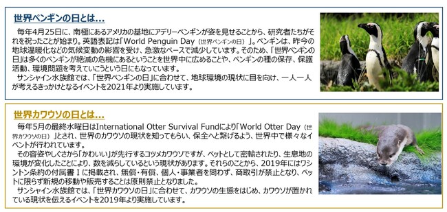 知って、感じて、行動しよう。ペンギン・カワウソのこと。*世界ペンギンの日:4月12日(金)~4月25日(木) 世界カワウソの日:5月17日(金)~5月29日(水)*