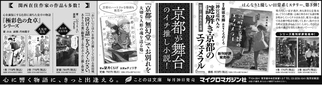 マイクロマガジン社(東京都中央区)は、ことのは文庫『神宮道西入ル 謎解き京都のエフェメラル』シリーズ、『京都「無幻堂」でお別れを 大切な人形の魂を送る処』、『「泣ける話」をひとつください。 あきらめの悪い編集者と忘れ去られた推し作家』、『極彩色の食卓』シリーズを京都新聞に掲載いたしました。