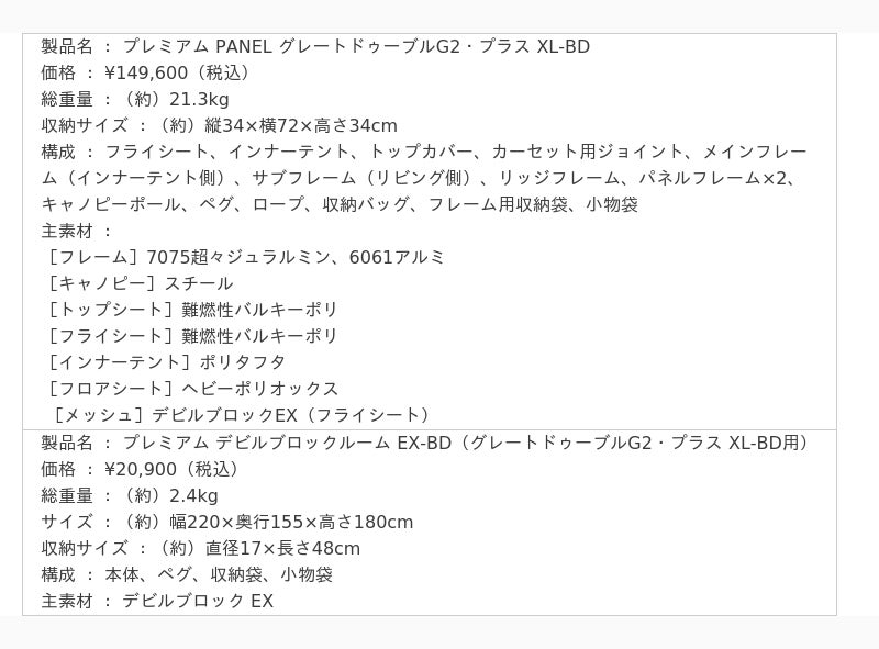 「プレミアム PANEL グレートドゥーブルG2・プラス XL-BD」「プレミアム デビルブロックルーム EX-BD(グレートドゥーブルG2・プラス XL-BD用)」は、ロゴス直営店をはじめ有名スポーツチェーン店・ホームセンターなど全国で発売しております。
