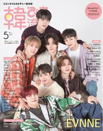 2024年5月号の表紙巻頭を飾るのは、オーディション番組『BOYS PLANET』出身、7人組グループEVNNE(イブン)。『UGLY』で韓国音楽番組2冠を達成し、Reebok Japanのブランドアンバサダーに就任決定。そして5月には『2024 EVNNE FAN-CONCERT [SQUAD:R] ASIA TOUR IN JAPAN』を行うと、今大注目のボーイズグループです。今号では、初めて1位を取った感想やファンコンサートの見どころまでたっぷりと語ってもらいました。ステージの上とは違ったさわやかなグラビアとともにお楽しみください。