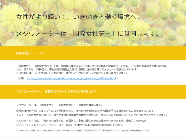 メタウォーター株式会社(社長:山口 賢二、本社:東京千代田区)は、2024年3月8日の「国際女性デー」(International Women's Day:国際女性の日)の理念に賛同し、同記念日に合わせて社内イベントを実施しました。