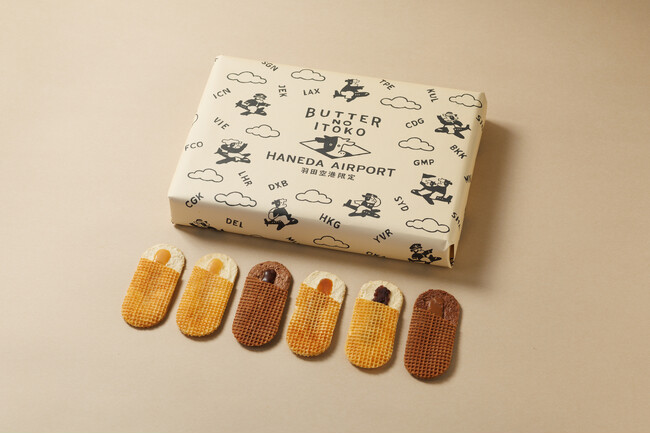ビターなキャラメルクリームと、フルーティーなカカオの風味感じる「チョコキャラメル」が入った羽田空港限定のご当地BOX。主要都市の空港コードとなるアルファベット3文字と、旅する可愛らしいバターのいとこキャラクター「いとこちゃん」のモチーフを散りばめたポップなデザインが目を引きます。
