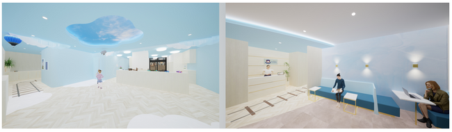 未来を象徴する保育園として、内装デザインは「空」をコンセプトに、室内全体の壁や天井にはどこまでも広がる空が描かれ、保育室に加えてお子様がのびのびと過ごせるピアッツァ(広場)や、キッチン前には食育にも使える広々としたランチホール(ダイニング)も備えています。また、保護者様が活用できるコワーキングスペースも設置予定です。