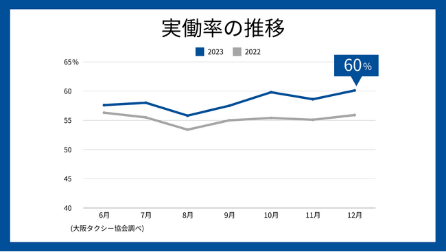 2023年4月から12月にかけて大阪市域交通圏内*1における乗務員数は900人増加しました。この乗務員の増加により、タクシーの実働率*2 が向上し、結果としてタクシーのつかまりやすさが向上しました。
