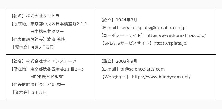 セキュリティ機器の開発・販売を行う株式会社クマヒラ(東京都中央区、代表取締役社長:渡邉 秀隆、以下 クマヒラ)は、株式会社サイエンスアーツ(東京都渋谷区、代表取締役社長:平岡 秀一、以下 サイエンスアーツ)が提供するライブコミュニケーションプラットフォーム「Buddycom」とクラウド型セキュリティサービス「SPLATS」との連携サービスを開始いたしますのでお知らせいたします。