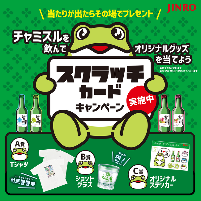 眞露株式会社(本社:東京都港区 代表取締役:朴 商 佖 パク サン ピル)は、チャミスルのオリジナルTシャツやショットグラスが当たる「チャミスル スクラッチカード キャンペーン」を開催いたします。
