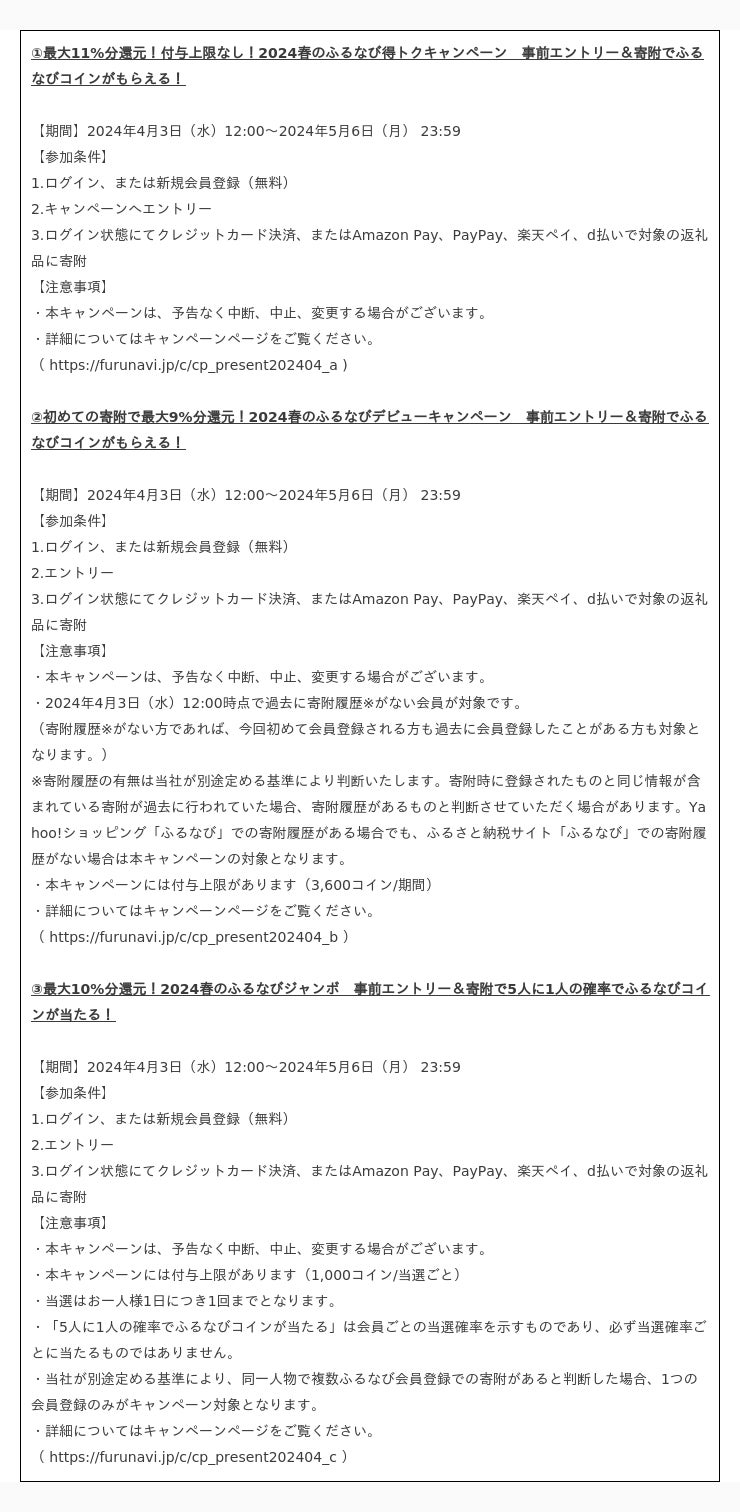 最大30%分還元!2024春のふるなびメガ還元祭 3つのキャンペーンに事前エントリー&寄附でふるなびコインがもらえる!