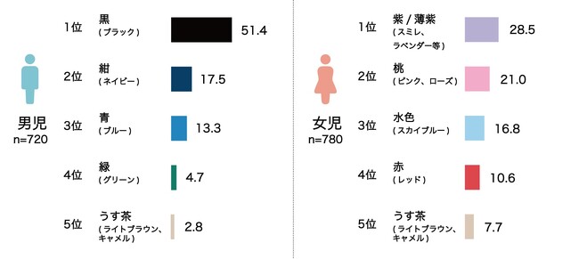 男の子は、定番カラーの「黒」が51.4%と6割を下回っており、例年と比較して減少傾向にあるのが分かります。「紺(ネイビー)」や「青(ブルー)」といったカラーが増加し、5位には昨年まで「こげ茶」がランクインしていましたが、今年は新たに「うす茶(ライトブラウン、キャメル)」がランクインしました。女の子は、「紫/薄紫(スミレ、ラベンダー等)」 が引き続き最多で拡大基調にあり、定番カラーの「赤」が継続して減少。「桃(ピンク、ローズ)」「水色(スカイブルー)」は増加傾向にあります。「うす茶(ライトブラウン、キャメル) 」は男女とも5位にランクインしており、男女両方から人気のある色だといえます。
