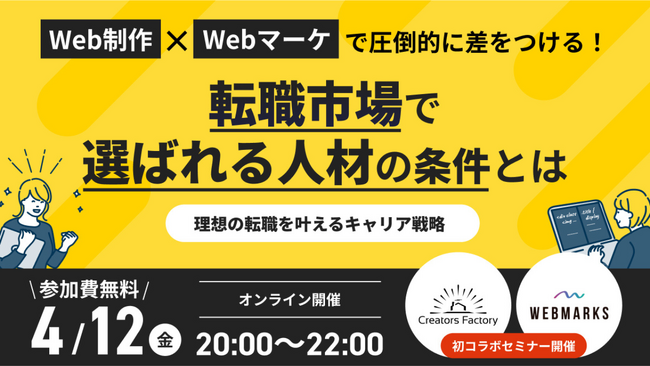 SEOと広告を本格的に学べる業界唯一のWebマーケティングスクール「WEBMARKS」を運営する株式会社WEBMARKS(所在地:神奈川県茅ヶ崎市東海岸北1丁目2番8号、代表取締役社長:鈴木 晋介、HP:https://webmarks.co.jp/)は、卒業なしで学べる実践的なWebデザイン制作スクール「クリエイターズファクトリー」を運営する株式会社Startkit(スタートキット)(所在地:大阪府大阪市西区北堀江1丁目1−23 四ツ橋養田ビル 7A、代表取締役社長:高橋 直通、HP:https://creators-factory.com/)と共催で、Web制作スキルとWebマーケティングスキルを掛け合わせ、キャリアを拓くノウハウをお伝えする無料オンラインセミナーを開催いたします。