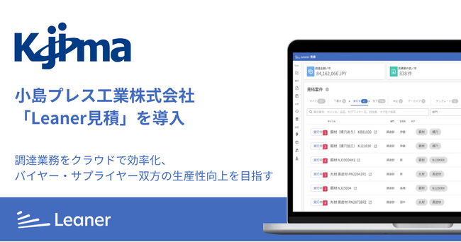 株式会社Leaner Technologies(本社:東京都品川区、代表取締役:大平裕介)は小島プレス工業株式会社(本社:愛知県豊田市、代表取締役:小島栄二)の調達部において見積業務をデジタル化し、収益性向上を実現する見積DXクラウド「Leaner見積」が導入されたことをお知らせいたします。