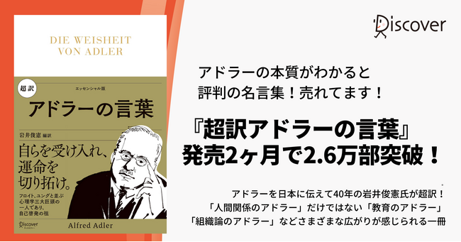 株式会社ディスカヴァー・トゥエンティワン(本社:東京都千代田区、代表取締役 兼 社長執行役員:谷口奈緒美)は、2024年1月26日刊行の『超訳 アドラーの言葉』(アルフレッド・アドラー/著、 岩井俊憲/編訳)を増刷、2.6万部を突破しました。