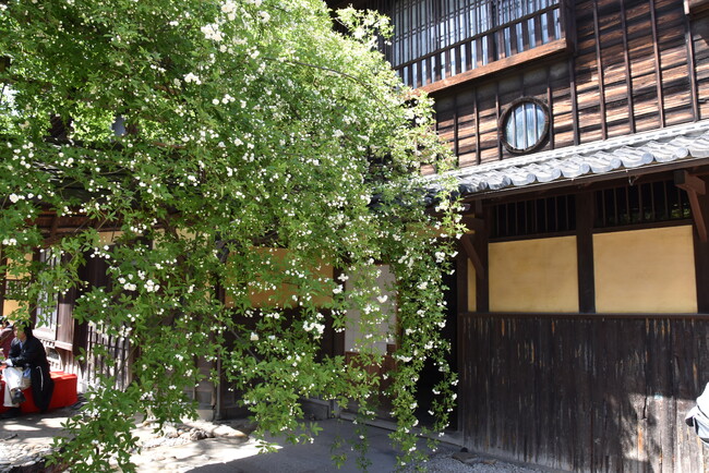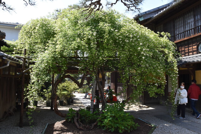 半田運河エリアに建つ国指定重要文化財の小栗家住宅。その庭にある、樹齢150年ほどの大きな白モッコウバラの花が咲く季節には特別公開が行われ、初夏の半田の名所になっています。