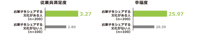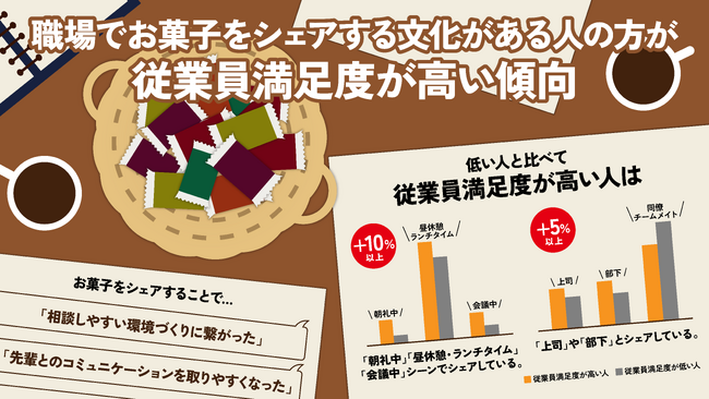 職場でお菓子をシェアする文化ある人のうち、従業員満足度が高い人のシェアするシーンやシェアする相手の傾向が明らかに。
