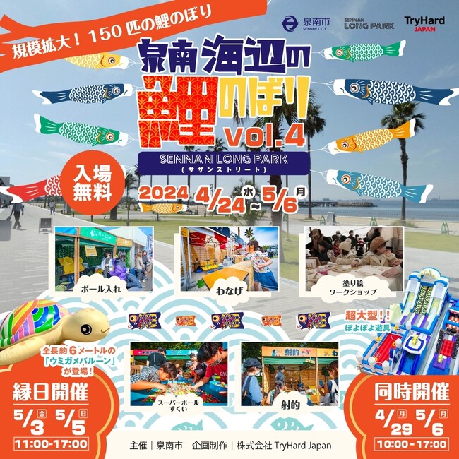 泉南市と株式会社TryHard Japan(所在地:大阪市中央区)は、泉南市のシティープロモーションの一環として、2024年4月24日(水)から5月6日(月・祝)の期間中、SENNAN LONG PARK(センナンロングパーク)にて「泉南海辺の鯉のぼり vol.4」を開催いたします。今年で4回目となる本企画は、泉南市の名所「タルイサザンビーチ」をバックに、大小様々な鯉のぼりを展示し、子供たちの健康と成長を祈る春の特別企画です。今年はなんと、昨年の1.5倍、150匹の鯉のぼり達が皆様をお迎えします! また、ゴールデンウイーク期間中の5月3日(金)から5月5日(日)には、毎年お子様に大人気の全長6mの巨大ウミガメバルーンの展示をはじめ、誰でも無料で楽しめる鯉のぼりの塗り絵ワークショップや、お祭り気分が味わえるこども縁日やフードトラック、そして全長15mの超巨大ぽよぽよ遊具がやってきます!爽やかな潮風吹くSENNAN LONG PARKで、家族団欒の楽しいひと時をお過ごしください。泉南海辺の鯉のぼり 公式サイト