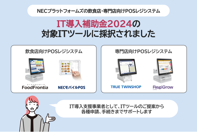 NECプラットフォームズは、IT導入補助金2024(令和5年度補正予算「サービス等生産性向上IT導入支援事業費補助金」)のIT導入支援事業者に認定されるとともに、当社が提供する飲食店・専門店向けPOSレジシステム等が対象ITツールに登録されました。本補助金は、中小企業・小規模事業者等の労働生産性の向上を目的に、企業の課題にあったITツールを導入する際に活用できます。